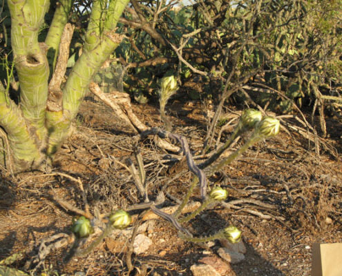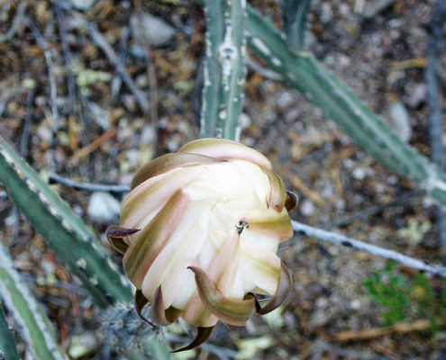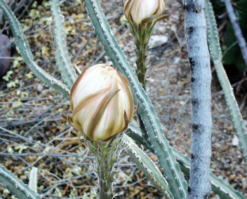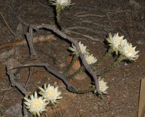 On that magical night, this innocuous cactus, native to the Sonoran and Chihuahuan deserts, unfolds its buds to reveal dramatic, white, fragrant flowers. Queen of the Night is known in the botanical world as peniocereus greggii, a species of night-blooming cacti and one of the desert’s most famous yet least encountered cacti. It is virtually invisible most of the year, with its thin, inconspicuous branches that are most frequently hidden amongst other cacti or shrubbery. However, during the summer, a trumpet-shaped blossom appears for only one night and its warm, soft floral scent delicately perfumes the desert night from as far as a quarter-mile away!